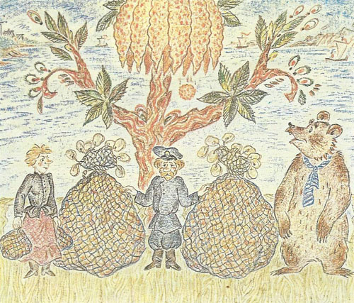 В другой новелле с непонятным вроде бы названием «Перепилиха» есть и гиперболизм; и социальная проблематика, и юмор. Перепилиха —. женщина, которая мужа все пилила да пилила. Как-то встретила в лесу медведя, так от страху такой силы голос у нее прорезался, что и медведя им контузила, и верхушки деревьев стала срезать. У мужа своего, мужичка Опары, в груди дырку голосом своим невольно просверлила. Узнаваемый характер через необыкновенность фантазии передан средствами мультипликации. Сюжет потребовал и необычайной выразительности. Так, например, голос Перепилихи художником передан графически. Фантазии авторов можно позавидовать. В киноновелле «Апельсин» ее, как говорится, бездна. Из случайно оброненного в море апельсина прорастает целое дерево, на котором постепенно наливается,. созревает тыква А из нёе затем . вываливаются сотни маленьких апельсинов. Много выдумки на экране, сказочного веселья. И яркой изобразительности. зх" чы сочетания острых типажей, свежих красок и карандашной, прозрачной, фактуры фонов. Существенна и такая, например, изобразительная находка. Незаходящее солнце, похожее на апельсин,— его радужный свет пронизывает все в этом фильме. Удачно соединяет все миниатюры в фильме «Смех и горе у Бела моря» сквозной сюжет: в северной избе во время шторма собрались рыбаки и с охотой слушают байки старого помора. Но вот шторм утихает. Настроения слушающих меняются, и в фильме — резкий перепад. Старик рассказывает историю иного характера.